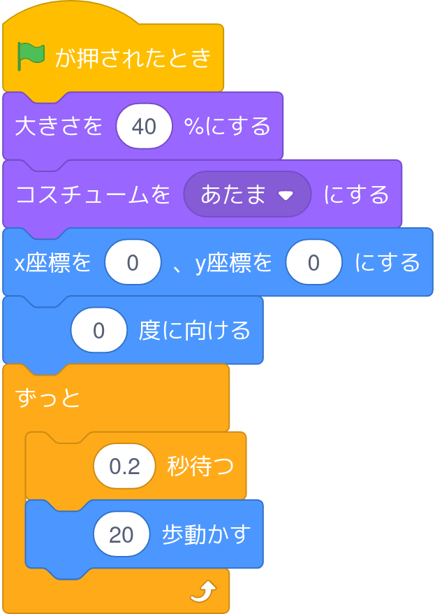 この4つを追加したら、右上を画面で「緑の旗」を押して実行してみましょう。