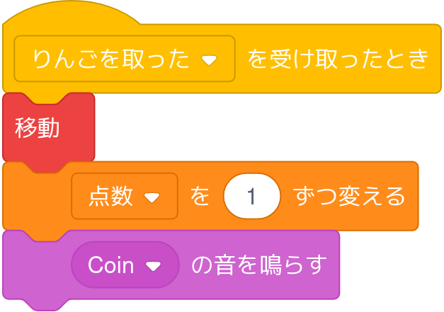 - 「[りんごを取った]を送る」(「[メッセージ]を送る」の新しいメッセージを「りんごを取った」にします)