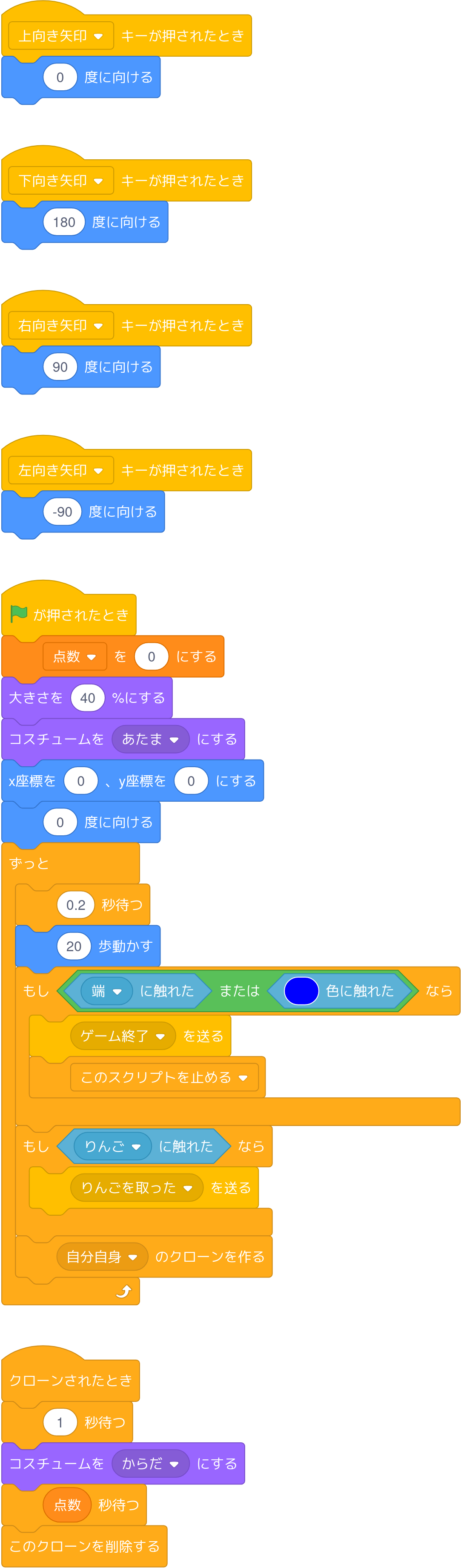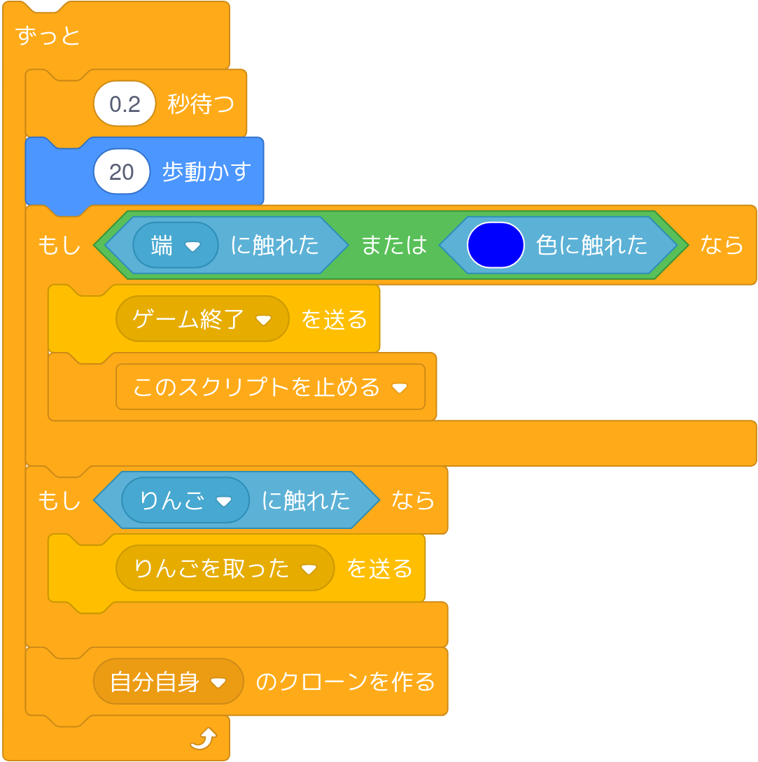へびがりんごを食べる(当たる)とへびのからだが伸びるようにします。そのためにはクローンされたとき、クローンを削除するまでの時間を追加で点数分待つようにします。