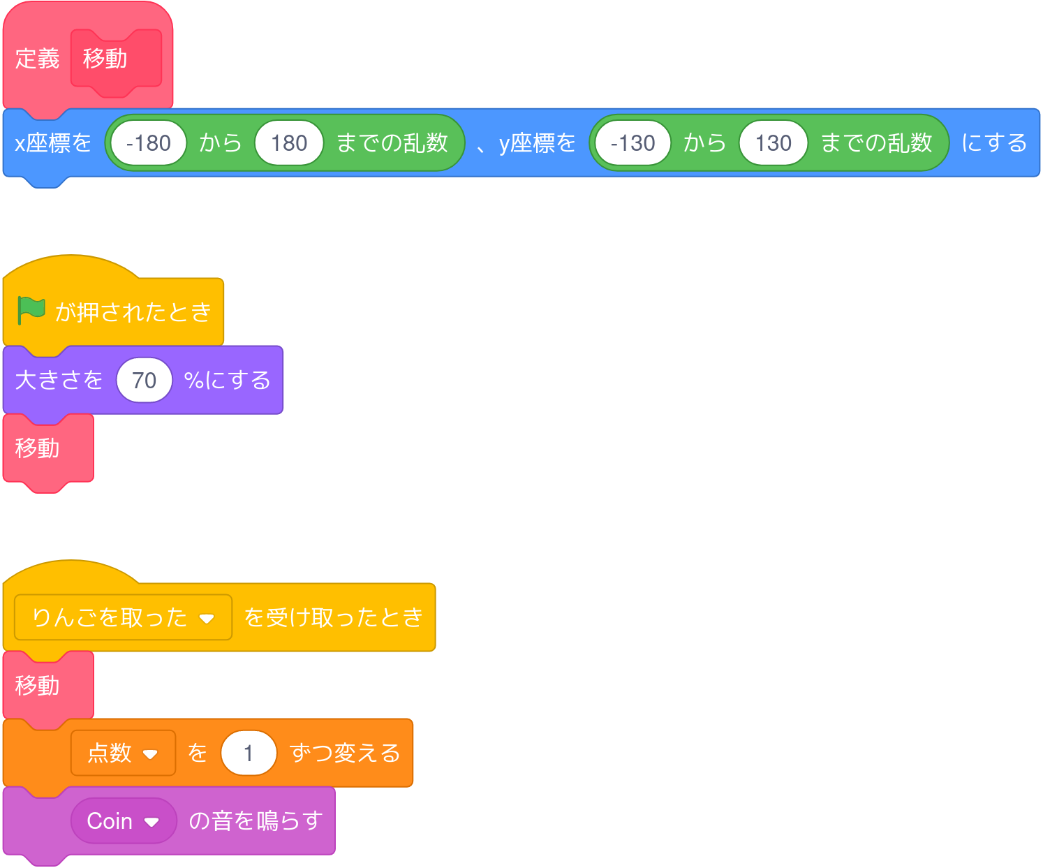 定義「移動」の後ろに、「x座標を((-180)から(180)までの乱数)、y座標を((-130)から(130)までの乱数)にする」を追加する