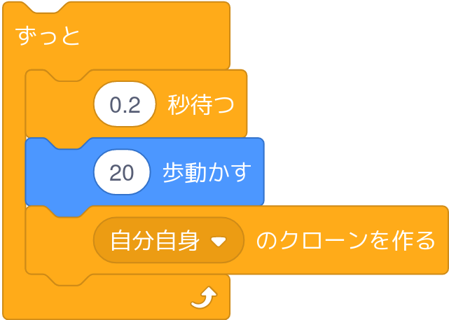 「(1)秒待つ」の(1)の値を変えると(例えば2にすると)、へびの長さが変わる(2倍の8個になる)ことがわかります。