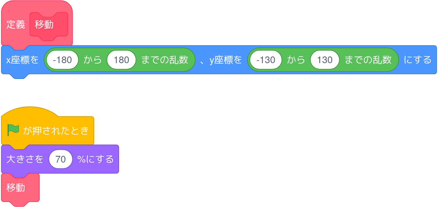 定義「移動」の後ろに、「x座標を((-180)から(180)までの乱数)、y座標を((-130)から(130)までの乱数)にする」を追加する