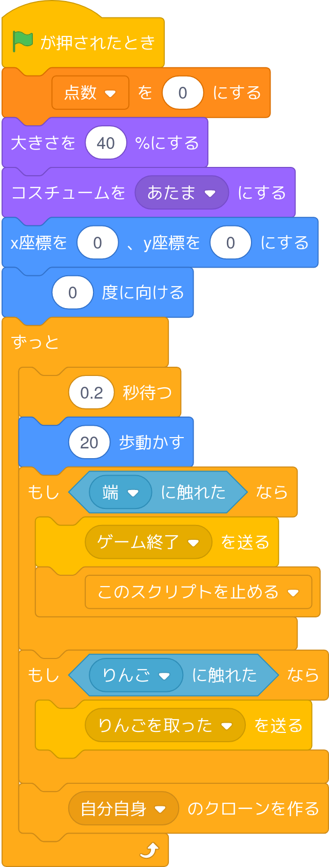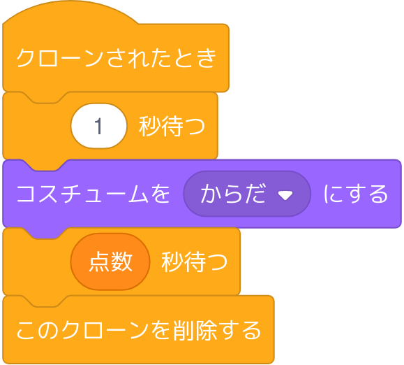 へびがりんごを食べる(当たる)とへびのからだが伸びるようにします。そのためにはクローンされたとき、クローンを削除するまでの時間を追加で点数分待つようにします。